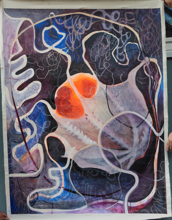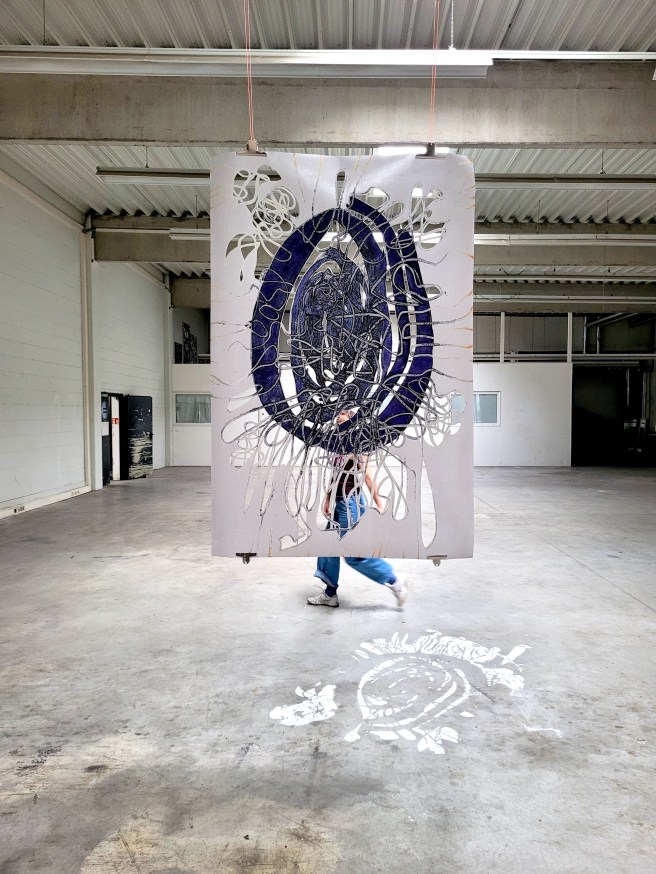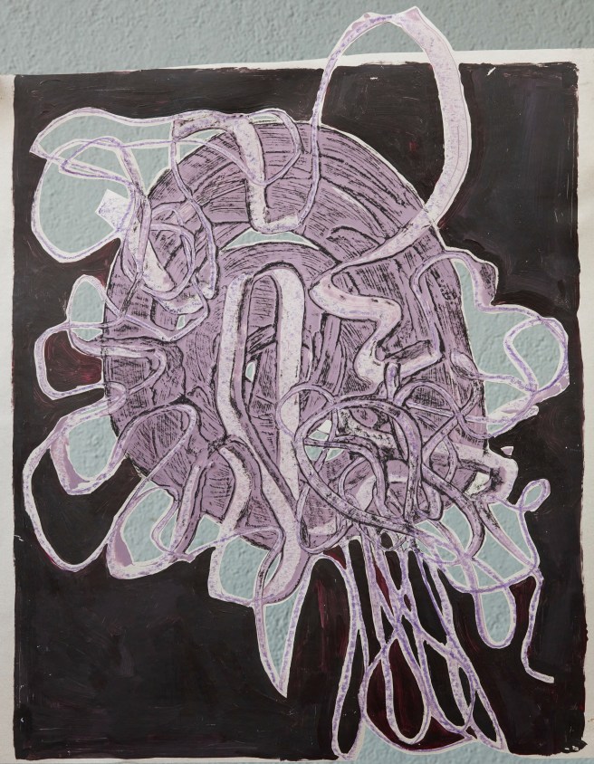 Anne Weyler arbeitet für ihre Kunst an den Schnittstellen von Bildender Kunst, Medienkunst, zeitgenössischem Tanz und Performance. Körperbilder, die z.B. von dem Oktopus oder der Amöbe inspiriert werden, bilden den Ausgangspunkt ihrer Arbeiten. Hierbei zieht sie schlaufenartige Linien durch die noch nasse Farbe und arbeitet anschließend die entstandenen Strukturen durch Schattierungen, Ausmalen und Ausschneiden der Hohlräume heraus. So wechseln sich Zufälligkeit in der Linienführung mit bewusst gewählten Entscheidungen durch Scherenschnitte und flächigem Ausmalen ab.