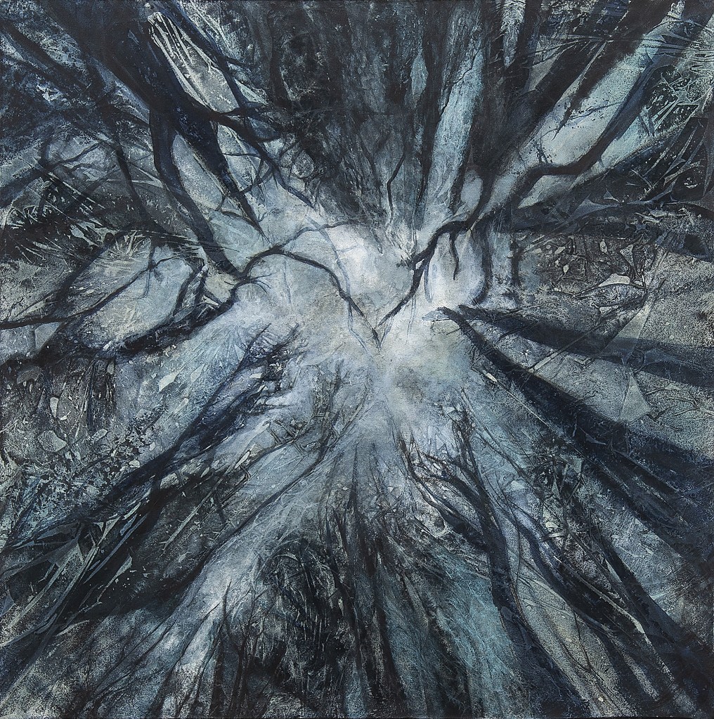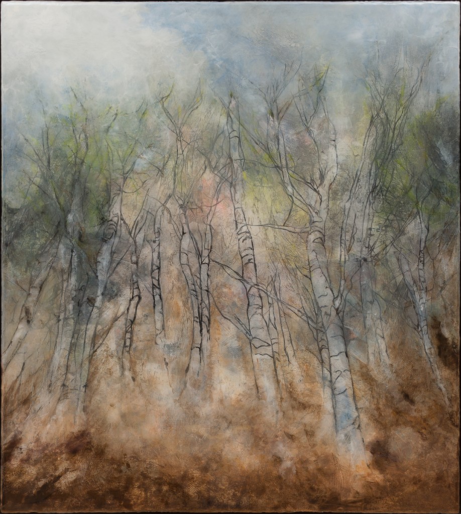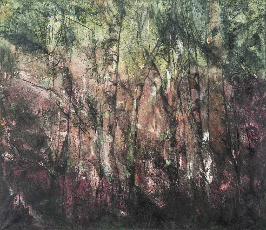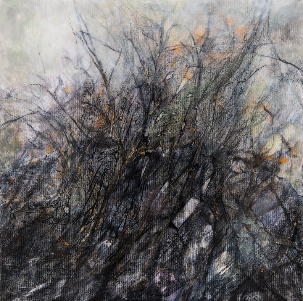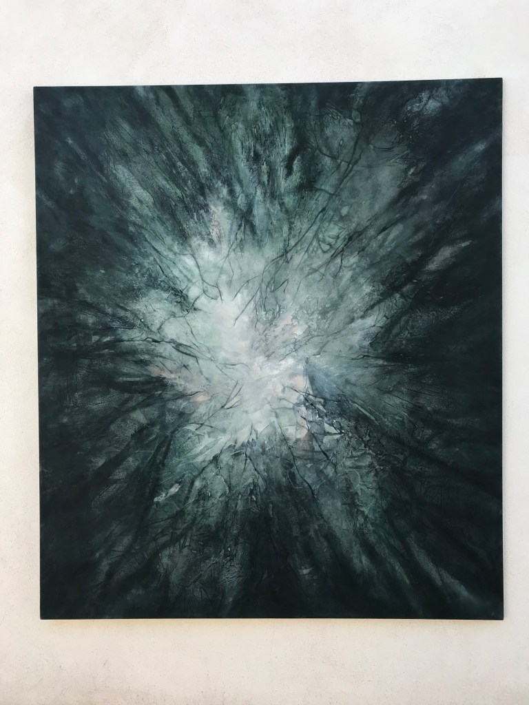 Ein weiterer Antrieb in meiner Arbeit ist die Erprobung unterschiedlicher Malmittel und verschiedenster Techniken, die ich experimentell anwende und auch miteinander kombiniere. In Auswahl verwende ich Kohle, Acryl, Ölfarbe, Enkausticwachse, Tusche, Resin oder angerührte Beizen sowie auch haptische Materialien und beziehe diese in den Malprozess mit ein.