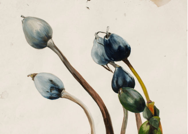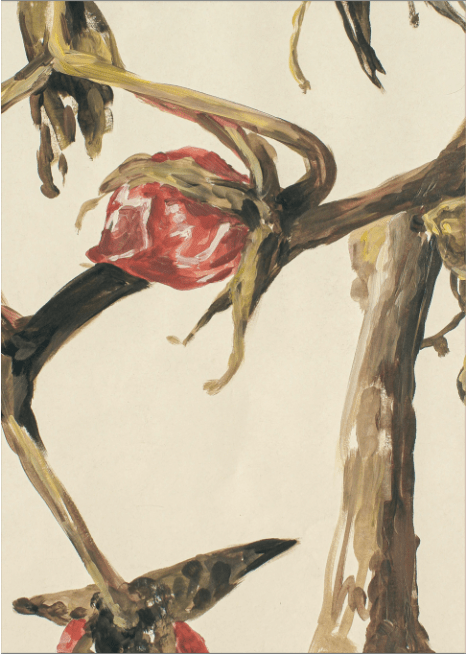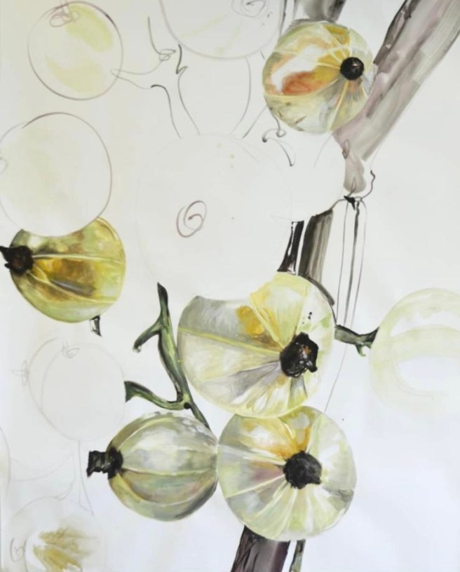 Ihre teils grafischen, teils malerischen Werke versuchen die außergewöhnliche Farbigkeiten und Beschaffenheit verschiedenster Gewächse einzufangen, wobei sich ein besonderes Interesse für verschiedene Beerenarten entwickelte. Dazu nutzt sie einen Materialmix aus verdünnter Acryl- und Aquarellfarbe, aber auch Filzstifte, Kohle oder Kreiden. Diese Materialien schaffen eine vielschichtige Darstellung, die keine Transparenz oder Auslassungen scheut. Die großformatigen Papiere bieten dabei den Untergrund für die schwungvollen Pinselstriche, die den Bildmotiven ihre Dynamik verleihen.