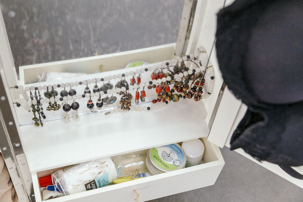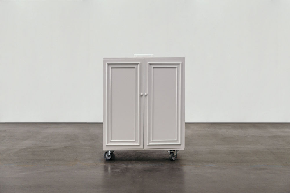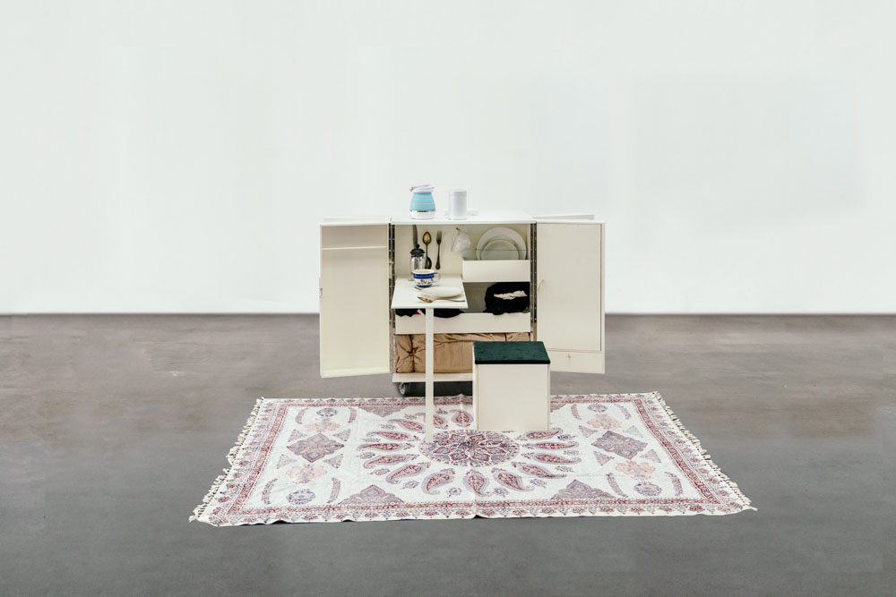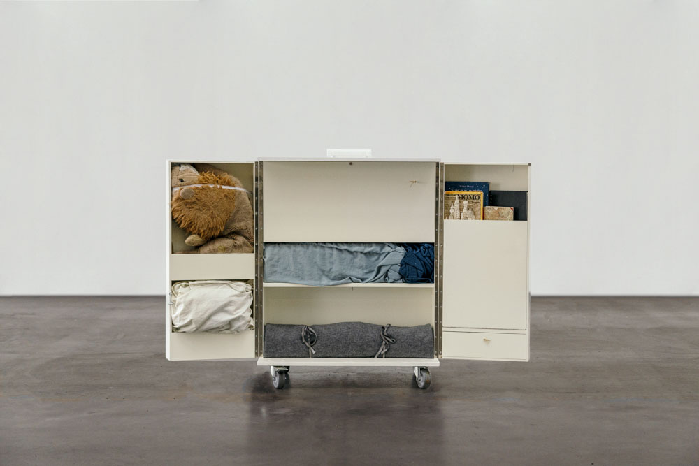Ahnlich wie ein Kofferschrank konzipiert, hinterfragt das kleine Möbelstück im Aussehen einer Kommode, wie komprimierbar der Begriff bzw. das Gefühl „Zuhause“ ist.