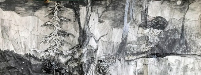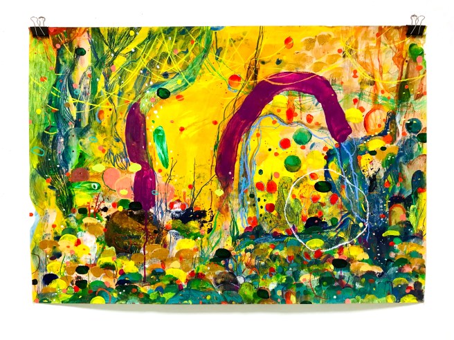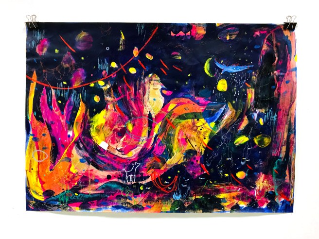 Bei der Entwicklung wechseln sich Aktion und Reaktion ab: Einer initiativen Fläche oder Linie folgen große, schnelle, impulsive Gesten gemischt mit feinen, langsam gesetzten Details und ergeben ein intuitives Arbeiten von einer Entscheidung zur nächsten.