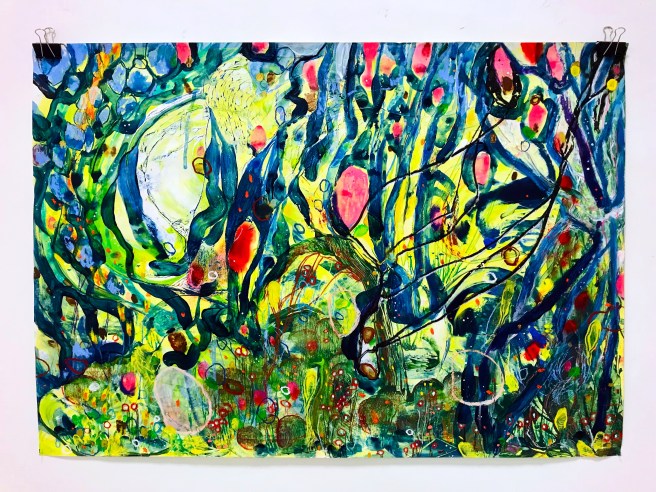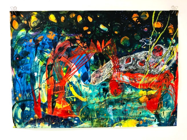 Die verwendeten Papiere müssen Einiges aushalten, da sie oft viel Farbe tragen müssen und einen längeren Bearbeitungsprozess in Schichten mit verschiedenen Techniken durchlaufen. Arbeitsprozess und Ergebnis werden dabei als gleich wichtig empfunden.
